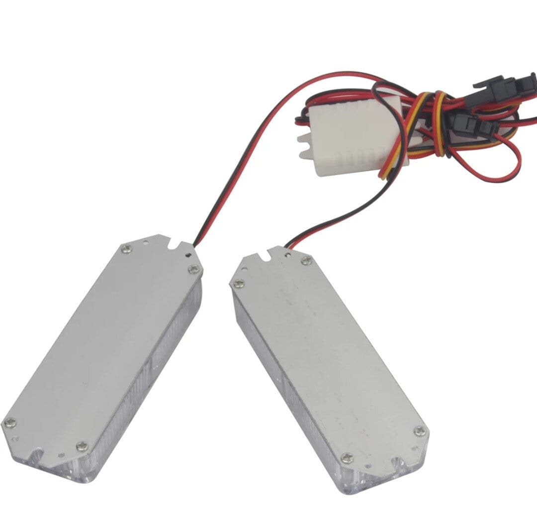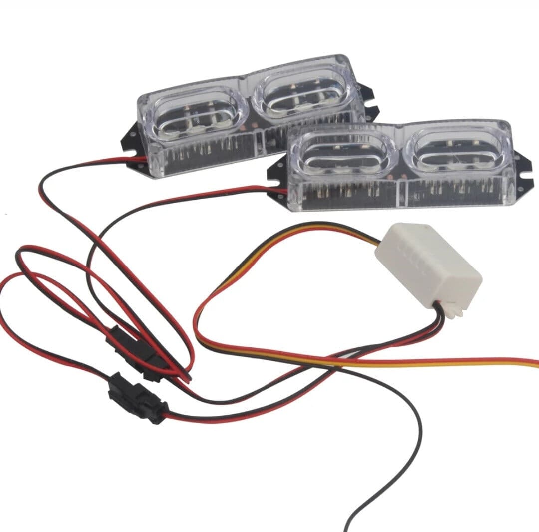 Яскравий світлодіодний комплект стробоскопів, призначений для позначення спец. транспортного засобу. Встановлюється під / в радіаторну решітку або під / в бампер автомобіля. Дана LED мигалка має 2 планки по 6 яскравих світлодіодів білого кольору, світло від яких видно навіть вдень. Живлення від бортової мережі автомобіля 12 В. Міцний корпус забезпечує захист від механічних і кліматичних впливів. Задня сторона планки і кріплення з алюмінію.